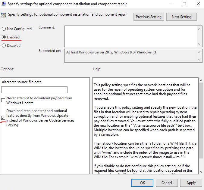 - And select Enabled and also check the checkbox "Download repair content and optional features directly from Windows Updates instead of Windows Server Updates Services (WSUS)".
